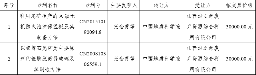 依据《施行〈中华人民共和国促进科技成果转化法〉若干规则》国发〔2016〕16号、《中国地质科学院科技成果转化办理细则》地科发〔2023〕87号等相关规则,并经第15次院长办公会审议经过,拟将我院两项发明专利“使用尾矿出产的A级无机防火泡沫保温板及其制备办法”、“以锂辉石尾矿为首要的组成原材料的低胀大微晶玻璃及其制作办法”进行专利权权属转让,受让方为山西汾之源抛弃资源综合使用有限公司。经两边协商一致,协议转让价格为3万元/项,两项合计6万元,转让后专利相关保护等费用由受让方承当。公示信息如下: